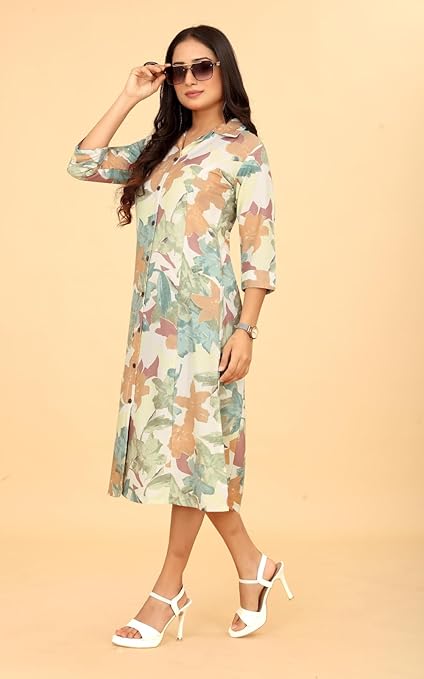 The Kesara A-Line Dress combines elegant western styling with comfortable rayon fabric, featuring a flattering floral print that enhances its feminine appeal. Its midi length and flared roll-tab sleeves provide a balanced silhouette, offering both style and freedom of movement. Ideal for casual or semi-formal occasions, this one-piece dress ensures effortless sophistication with every wear.