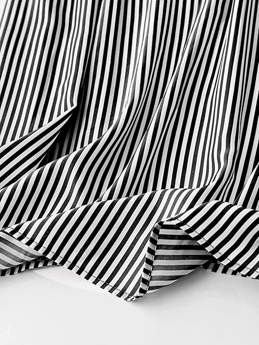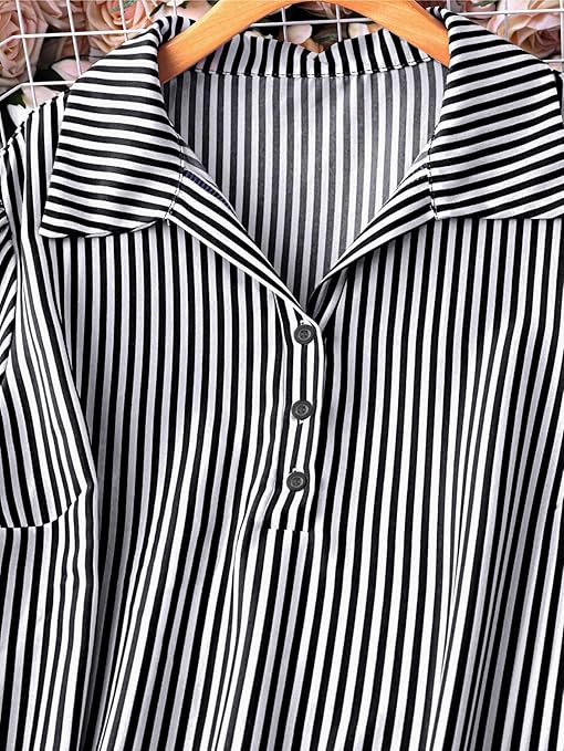 The Lunaria Fashion striped shirt-style mini dress features a structured collar and an A-line silhouette that flatters various body types. Designed with elegant tie sleeves and a classic button front, this tunic offers both style and comfort ideal for day-to-night wear. Its breathable fabric ensures ease of movement, making it a versatile addition to any wardrobe.